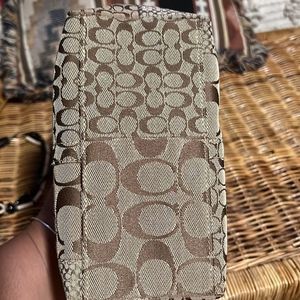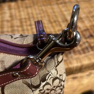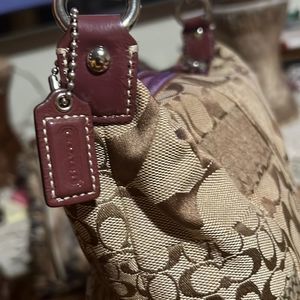 Stylish Coach bag with signature pattern. Features brown and purple tones. Perfect for any occasion.