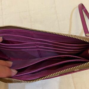This elegant Coach wristlet combines the brand's signature style with a sophisticated brown and purple color palette. Crafted for convenience, it features a sleek design ideal for carrying essentials. The luxurious leather accents add a touch of refinement to this versatile accessory.