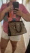 Stylish Coach satchel with signature pattern. Features brown body and red handles. Gold hardware adds elegance.