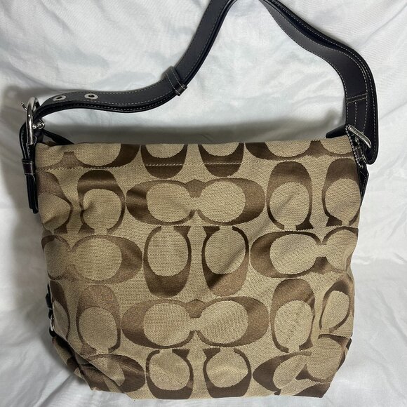 Stylish Coach shoulder bag. Features signature pattern. Comfortable strap for easy carrying.