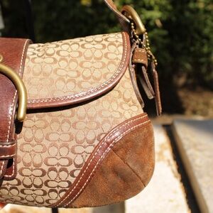 Stylish Coach shoulder bag. Features signature pattern. Brown leather accents. Perfect for any occasion.