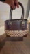 Stylish Coach satchel with signature pattern. Features brown leather accents and sturdy handles. Ideal for everyday use.