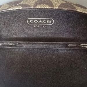 Elegant Coach eyewear case with iconic brown and tan pattern. Keeps glasses stylishly protected.