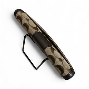 Stylish Coach wallet with signature pattern. Features brown leather accents. Perfect for everyday use. used condition. Please look at pictures for condition and description. As is. Final sale. No returns. Smoke free, pet free home wallet only.