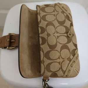 Coach canvas and leather studded wristlet/wallet. Brown and tan, magnetic closure, and a little bow in the back with a 7" wrist strap. Also has little brass studs along the flap and on the wrist. EUC