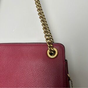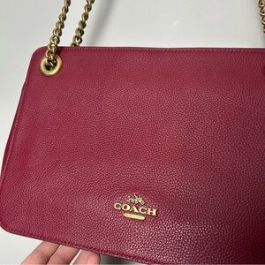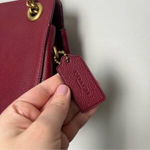 Beautiful deep red/maroon bag with gold hardware and Coach emblem detailing. Handles convert to shoulder strap with 21.5" drop. Outside slip pocket. Inside zip pocket, inside snap pocket. Magnetic closure. Center zip compartment. Very minor wear shown. Great condition!