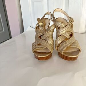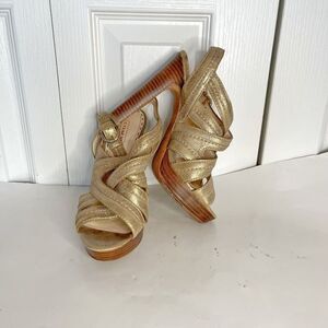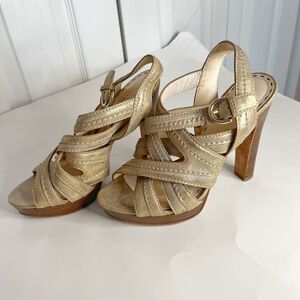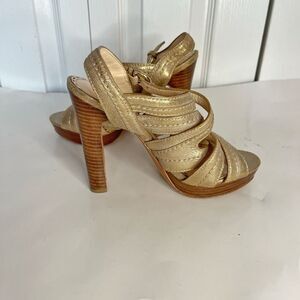 Coach Brynne Leather Metallic Gladiator Strappy Stiletto Wood Slingback Sandals