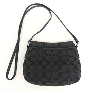 The Coach Small Crossbody Bag is a stylish and compact accessory perfect for any fashion-forward woman. With a black jacquard exterior and silver hardware accents, this small bag features a soho buckle accent on the front flap. The black patent thin crossbody strap adds a touch of sophistication, while the fabric lining in black complements the overall design. The crossbody style makes it easy to carry on the go, adding a touch of designer flair to any outfit. 9X6.5X1.5 Pre owned, clean inside and out. the jacquard fabric has some wear on the back side near the bottom. No inside tags.
