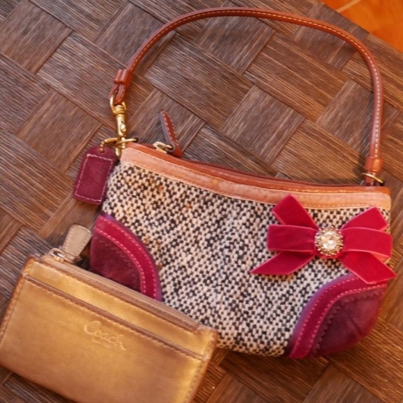 This Coach bundle includes a gold card holder and small wristlet size purse. The wallet is pretty well used but still has lots of mileage left despite the scuffing. The purse is great condition with the exception of a couple small orange spots. I thought it was part of the pattern. Will ship in a shiny coach box.๐ perfect for the holidays. Will accept offers.