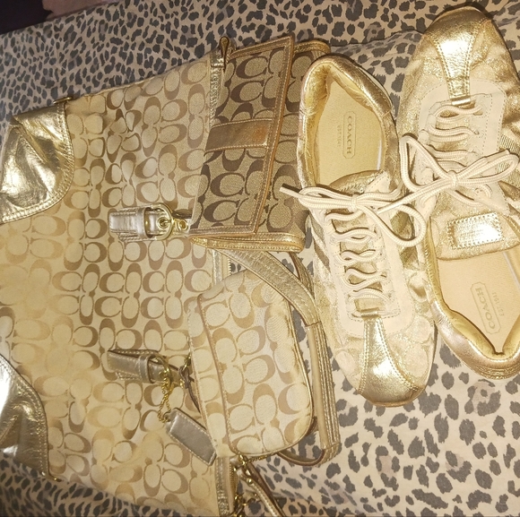 Purse Gold wallet & shoes still in pretty fair condition shoes a size 9.