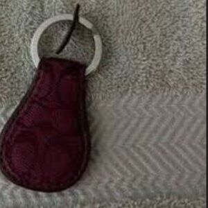 Elegant Coach bag charm. Rich burgundy color. Signature pattern design.
