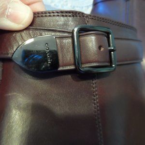 Say hello to your new go-to boot. Crafted form sophisticated calf leather, this Coach bootie features cushiony memory foam padding for all-day comfort and an elegant 3.4" stiletto heel. It’s finished with a wrapped archival monogrammed buckled strap for an iconic Coach touch and handy zips so you can get them on and off easily. Measures: Leg opening 9.5", heel 3.5" in height, shaft height 4 1/4" from the back of the heel. In almost new condition. Replaced outsole for a better traction. Size 6M. Retail for $345. No scuffs or stains. Come from a smoke free home.