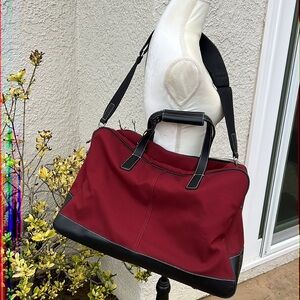 Coach Burgundy Double Handle Nylon & Black Leather Weekender Suitcase Bag with Adjustable Shoulder Strap. Silver harware detail.