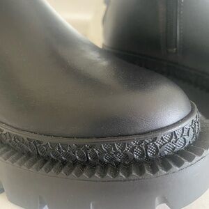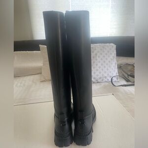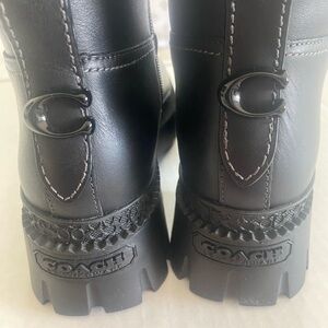 Step up your boot game with these brand new Coach knee-high lug sole boots in sleek black leather. Featuring bold utility-inspired details and the signature Coach “C” logo embossed on the back, these boots blend fashion with function for the ultimate fall/winter statement.