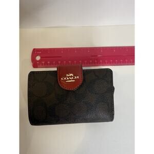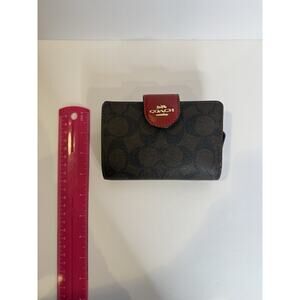 Coach C0082 Small Trifold Wallet — Signature Brown Canvas with Red Leather Trim