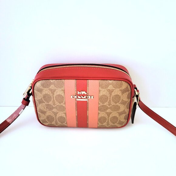 Coach CAQ42 Mini Jamie Camera Bag Signature Stripe Crossbody Handbag Tan Multi