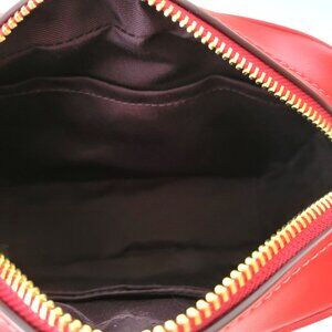 2 toned Tan medium "C" Signature w/multicolor "Stripes" coated canvas and Red smooth leather