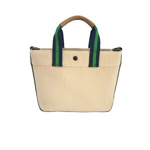 Handle: Tan smooth leather and Blue/Green striped woven polyester blend canvas