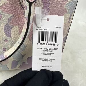New with Tags, COACH Maggie Small Tote Bag Crossbody Floral Print In Leather Ivory/Purple CBM08 + CBO31 Medium Corner zip wallet, from smoke and pet free environment.