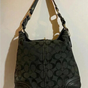 Coach black gray CC signature print canvas satchel handbag with black leather strap & trim silver hardware main compartment 3 pockets at interior wall 1 zip closure fabric lining hangtag at side turn lock closure at top lining have some ink stains exterior front & back have tear hight 10” width 11” depth 3.5” strap drop 8” The dimensions are based on approximately measurements before placing an order please check take a moment to view all photos using feature for a closer look
