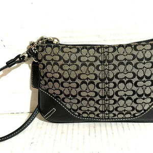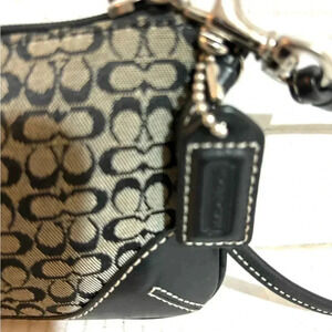 Coach CC signature, print canvas/ leather wristlet fabric lining hangtag at side hight 4” wide 6” depth 2”The dimensions are based on approximately measurements before placing an order please check take a moment to view all photos using feature for a closer look