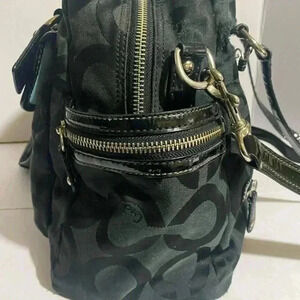 Coach CC signature print canvas logo satchel handbag with silver tone hardware 2 compartment 7 pockets at interior wall 2 zip pocket closure fabric lining 2 pockets at both side zip closure zip closure at top turn lock pocket closure at center 4 protective metal foot base hangtag at front 2 zip pocket closure at back 1 strap handle have cracks hight 13” width 14” depth 6” strap drop 10” shoulder strap 28” adjustable