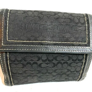 Coach CC signature print canvas wallet with silver tone hardware main compartment 2 cash slots 10 cash slots open pocket at back under flap minor marks scratches hight 4” width The dimensions are based on approximately measurements before placing an order please check take a moment to view all photos using feature for a closer look