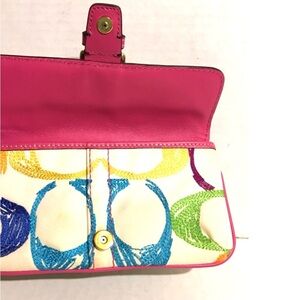 Coach vintage CC signature print wristlet leather trim with gold tone hardware fabric lining hight 4” wide 7.75” The dimensions are based on approximately measurements before placing an order please check take a moment to view all photos using feature for a closer look minor stains strap handle