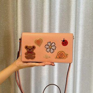 Coach CC469 Anna Foldover Clutch Crossbody With Creature Patches Candy Pink Mult