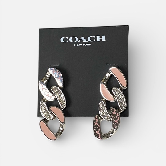 A bold, playful pair of Coach drop earrings featuring the iconic Signature motif, vibrant enamel accents, and sparkling pavé crystals. The chunky curb‑chain design adds a modern edge while still keeping that unmistakable Coach charm.