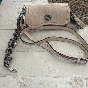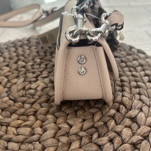 Elegant beige leather crossbody bag. Features silver hardware and a stylish chain strap.