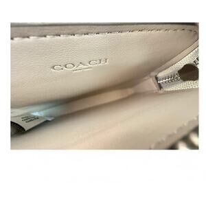 Sleek and compact Coach ID case wallet in metallic silver leather. Features exterior card slots, a clear ID window, and a top zip compartment with chain. Perfect for on-the-go essentials or clipping to a larger bag.