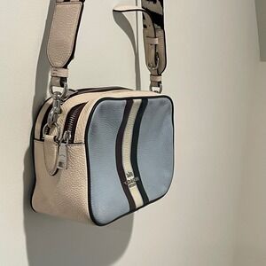 Keywords: Coach, Camera Bag, Crossbody, Purse, Handbag, Blue, Leather, Stripe, Zebra Strap, Designer Bag, Small Bag, Everyday Bag, Stylish, Fashion