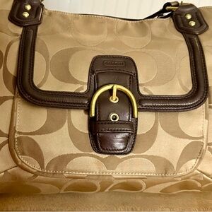 In Excellent Condition and truly stunning describes this Authentic Coach Campbell Signature Belle Khaki Shoulder Bag with Black Leather Trim.