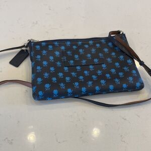 Stylish Coach crossbody bag with blue floral pattern. Perfect pairing for all the cute summer cottage core Prairie style boho dresses.