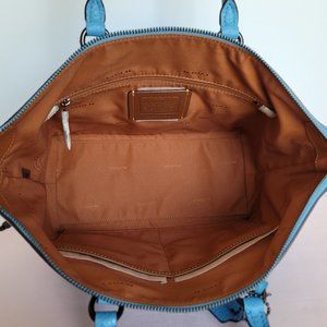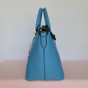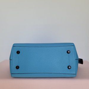 BRAND NEW WITH TAGS. Pool color. A stylish large satchel with roomy interior for all your essentials. Designed with a wide opening elongated zipper with several interior pockets for easy organization plus an exterior back zip pocket for additional storage and easy access. Crafted of soft pebbled leather with top-zip & Turnlock closure. Features dual handles and a long strap for shoulder or crossbody wear.
