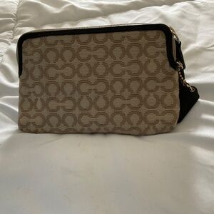 Beige Coach monogram fabric with brown leather trim