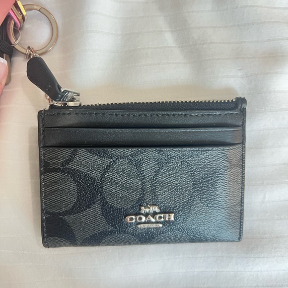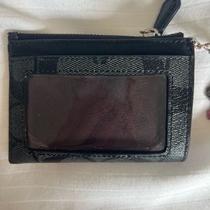 Black logo Coach cardholder with keyring holds your credit cards and cash. Features a backside ID holder as well. Good condition.