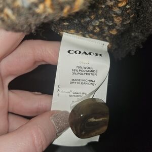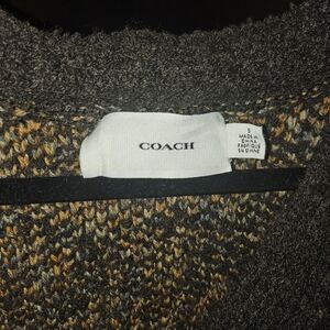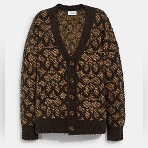 Elegant Coach cardigan with a bold logo pattern. See all photos because color differs based on lighting. I took pictures with and without flash. Features a stylish button-up front. Comes with a spare button. Perfect for layering. Made for an oversized look so it could fit multiple sizes. Labeled size small. Only worn a few times. My comments and replies are not showing up for some reason?? Waiting for a response from poshmark support. I will edit the listing with an answer if you have questions in the meantime.