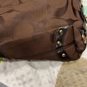 This Coach Carly Bag is a stylish addition to your collection. The exterior is made of canvas and leather in a beautiful brown color, while the interior lining is also the signature print material.