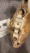 Stylish vintage Coach Carly shoulder bag in tan and gold. Features signature pattern and elegant design.