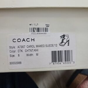 Coach Carol Waxed Suede Boots, Sz 8. Excellent condition, no signs of wear. Brown suede lace up with Coach logo pattern around top of boot. Rugged rubberized sole with super high block heel. In original box. Smoke free home.