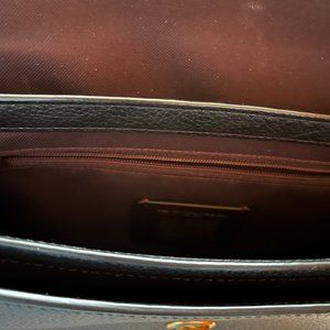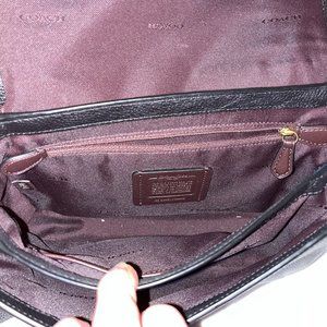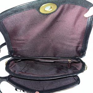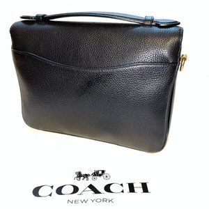 Sleek black leather crossbody by Coach. Gold-tone hardware adds elegance. Ideal for versatile styling. Great shape.