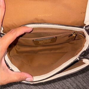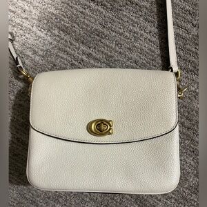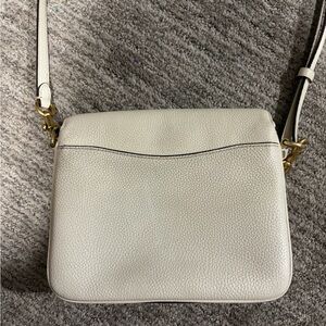 Coach style 88346 “Cassie Crossbody Bag 19” cream white leather crossbody bag comes with long adjustable strap. Super clean on the inside & out. does not come with the original hangtag sadly. 2 flaws 1. on the back where a line is that appears whiter than the bag and 2. where my finger is in the 5th picture the lining on the top is worn. The metal is still super shiny, whole bag might just need a little clean and it’ll be like new!!