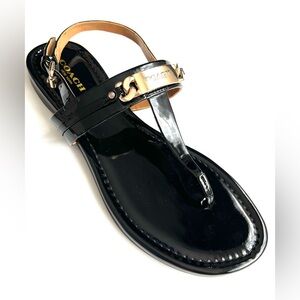 Brand new no box Bright signature hardware accents the simple shape of a minimalist sandal with the look of lacquer. Its refined design is finished with smooth leather linings and a lightly padded insole. Upper: patent leather (black); Rubber-covered leather sole Style no: #A7799