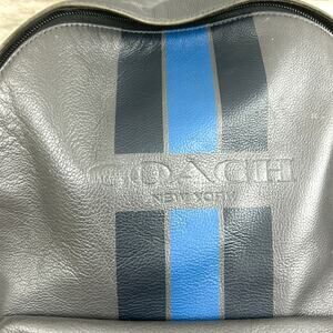 Coach Charles backpack, men’s leather backpack, gray blue striped bag, Coach men’s designer bag, leather travel backpack, Coach commuter backpack, Coach men’s leather stripe bag, everyday leather backpack, luxury men’s Coach bag