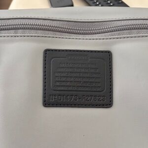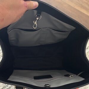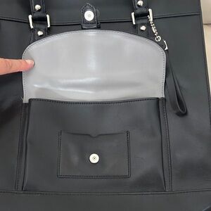 Access to the interior is granted through the top that has a dog-leash clip to keep it secure. The front wall has two slip pockets for cell phone, I-pod or whatever else you may choose. In the center is a pen pocket. The back compartment has the zippered interior pocket with the Coach creed patch.