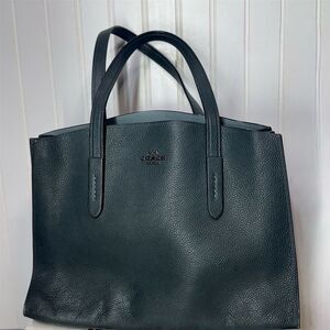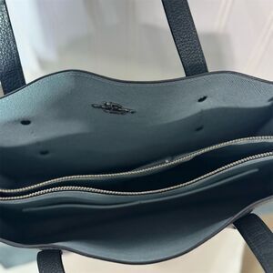 Authentic Coach Charlie Carryall in Midnight Silver — a deep navy-blue leather with subtle cool undertones and soft teal interior. Crafted in richly textured pebbled leather with minimal branding and clean structure, this tote perfectly fits the quiet luxury and elevated essentials aesthetic.