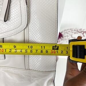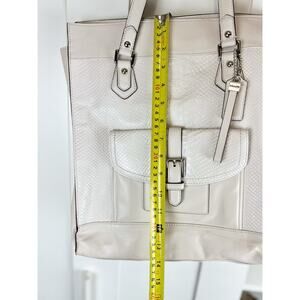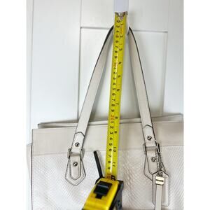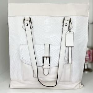 Coach Charlie Embossed Python Leather Large Tote Bag F28723 Limited Edition. Python embossed leather exterior in white. Double handles. Magnetic front flap pocket with buckle accent. Zip-top closure. Interior pockets. Keyholder. Silver-tone hardware. 8" strap drop. Style# F28723. This RARE and LIMITED EDITION tote is perfect for elevating your look at upscale events or making a statement during stylish outings.