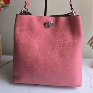 Elegant coral color Coach Charlue leather tote bag perfect for any occasion. The bag looks great at exterior with some moderate corner rubbing. The strap is missing and the bag has deffects at interior. It shows some separation on the top by the lock and at the bottom. It looks like it wasnt trimmed properly and skipped somehow quality control at Coach facility. But overall bag looks great very cool for every day and if you are a bit crafty you can patch it up.